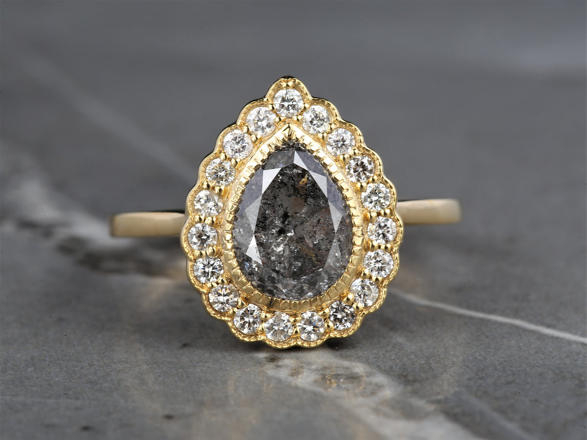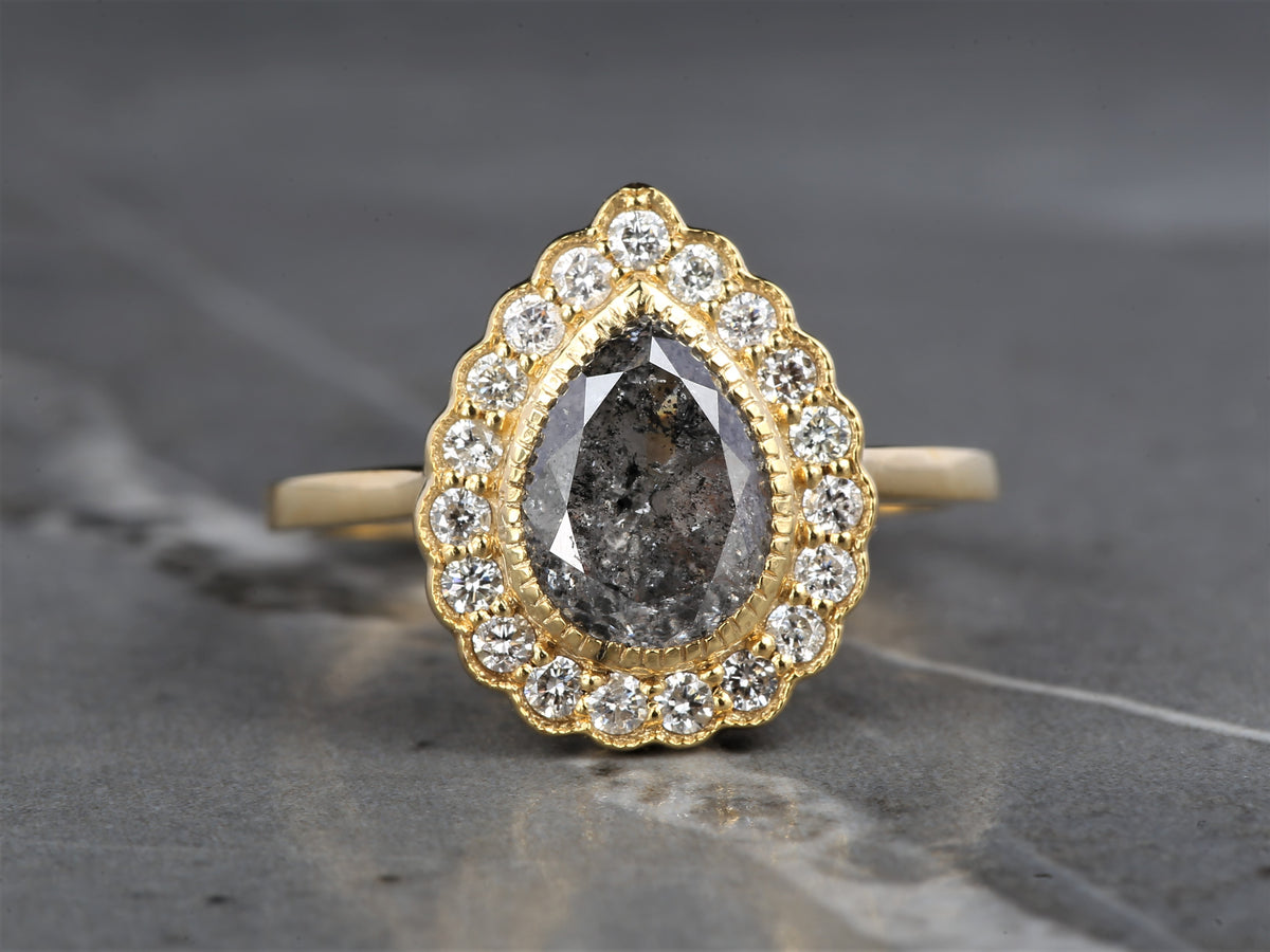 salt and pepper diamond ring, natural gray color pear diamond engagement ring, unique diamond 14k gold halo ring, anniversary ring for women