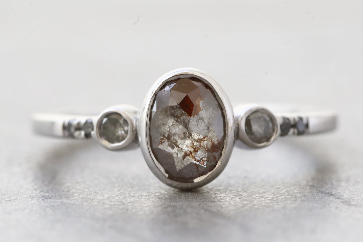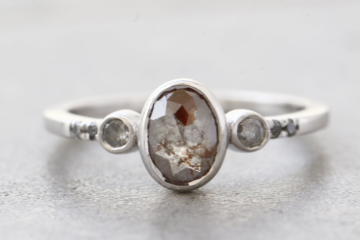 Salt and Pepper Diamond Ring, 14K Gold Engagement Ring, Natural Gray Oval Diamond Bezel Ring, Unique Gift for Her